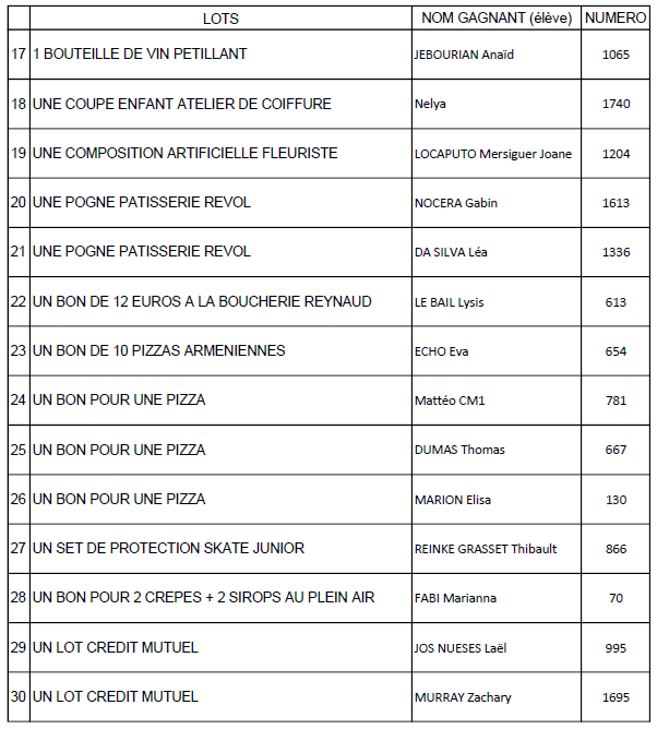 Vouc trouverez ci-dessus la liste des gagnants de la tombola dont le tirage a été réalisé hier, mardi 29 juin à 18h.