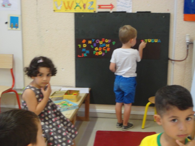 On apprend à reconstituer son prénom avec les lettres magnétiques; Au début ce n'est pas toujours facile d'écrire dans le bon sens.Mais on y arrive....
