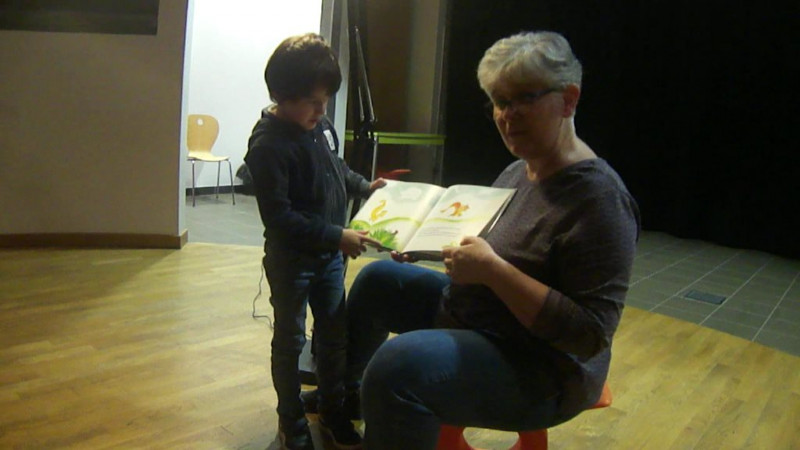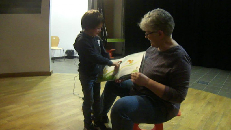 Ensuite, Christine demande un assistant et Gabin très volontiers se prête au jeu en se portant volontaire pour raconter à son tour l'histoire du lapin. Gabin a bien réussi la tâche, aidé de tous ses petits camarades.