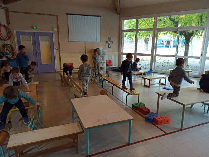 Nous profitons de notre intervenant Bob pour développer notre motricité en faisant plein de parcours.